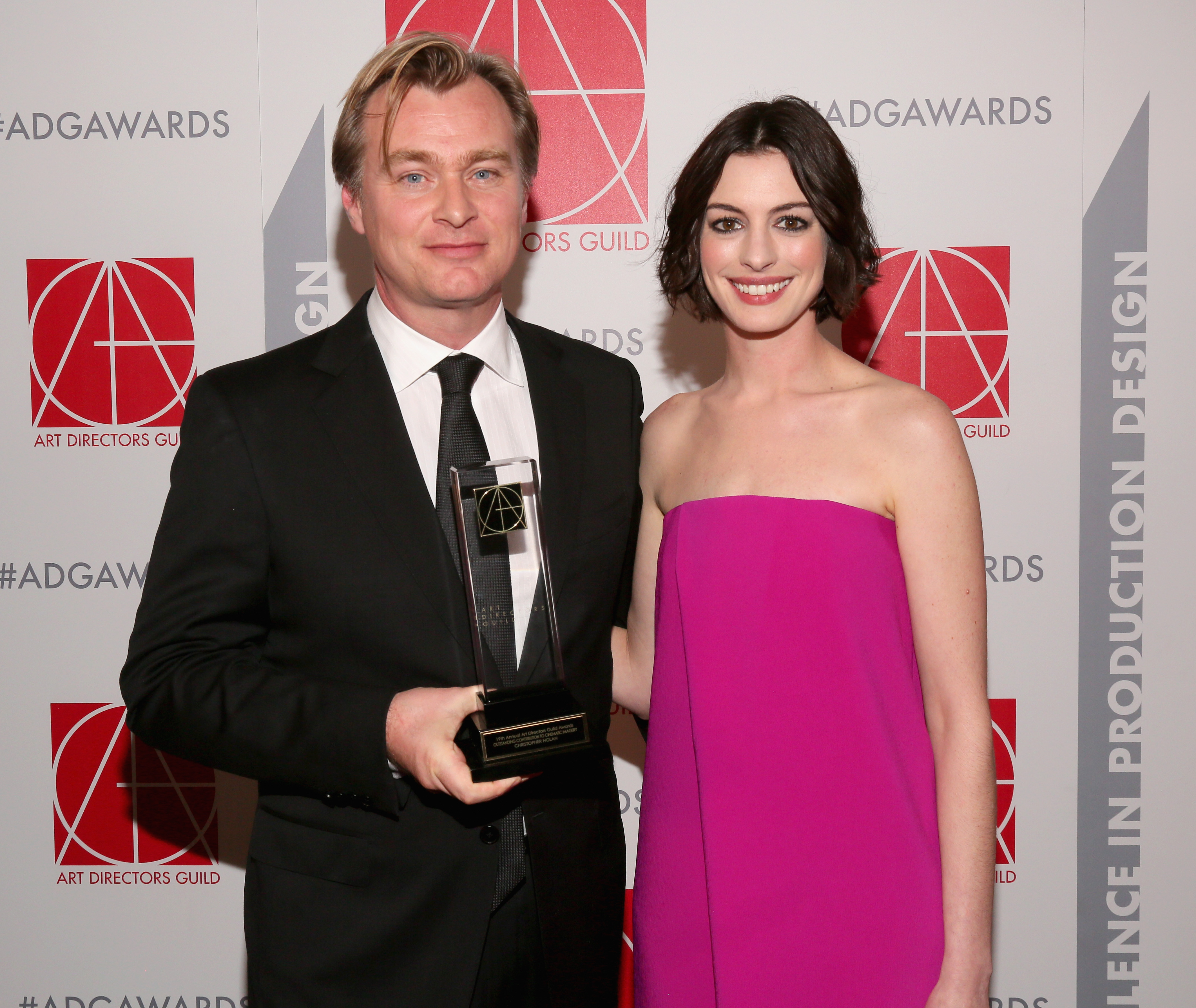 BEVERLY HILLS, CA – JANUARY 31: Recipient of Outstanding Contribution To Cinematic Imagery Christopher Nolan (L) and presenter Anne Hathaway attend the 19th Annual Art Directors Guild Excellence In Production Design Awards at The Beverly Hilton Hotel on January 31, 2015 in Beverly Hills, California. (Photo by Mathew Imaging/WireImage) *** Local Caption *** Christopher Nolan;Anne Hathaway